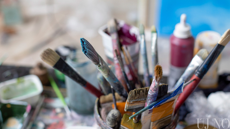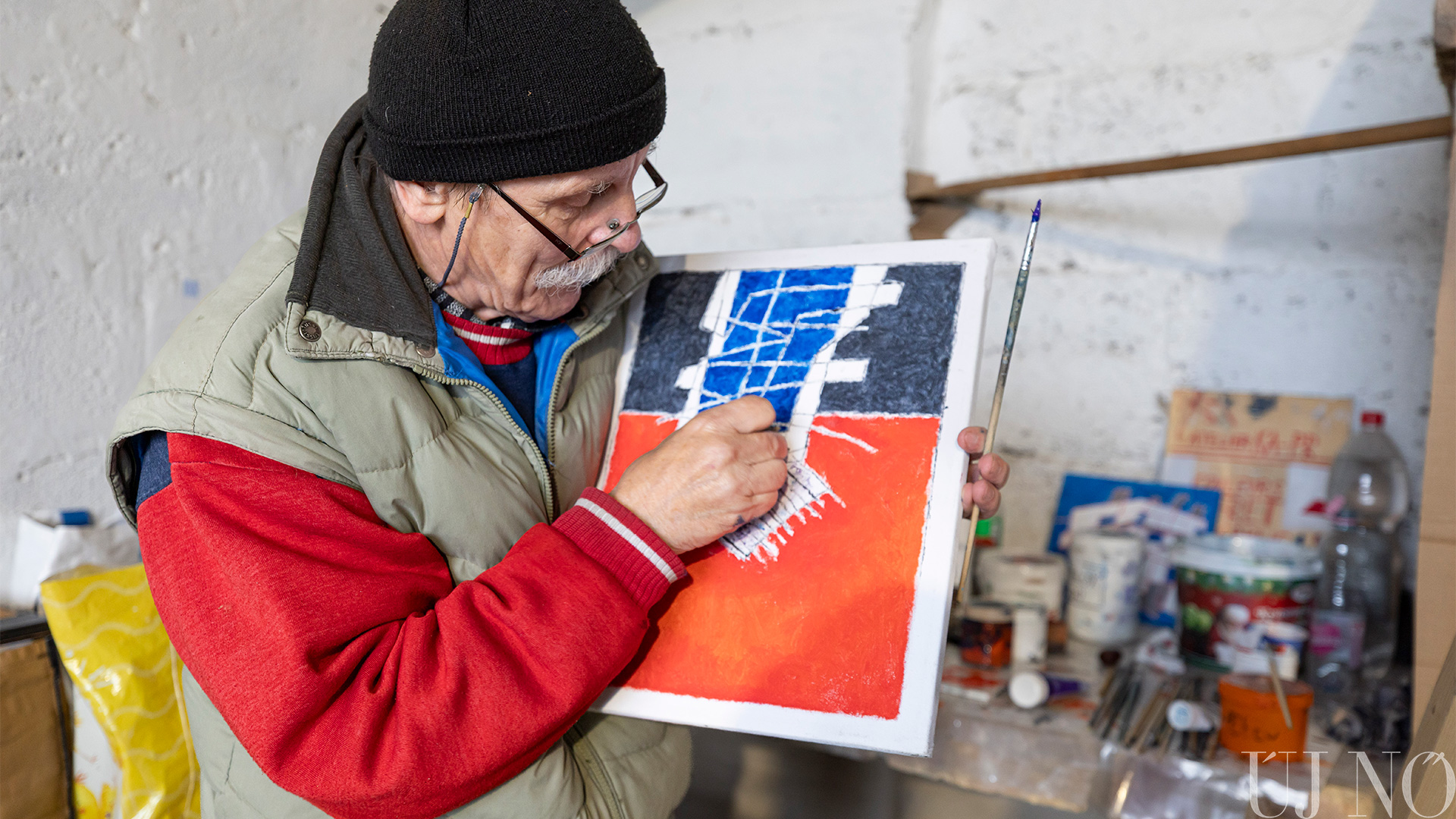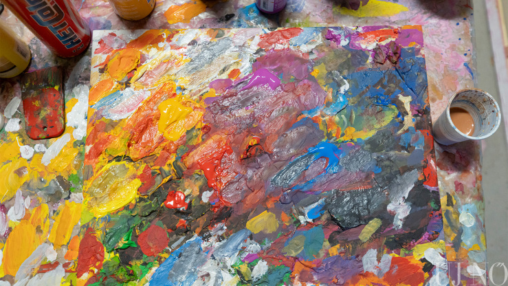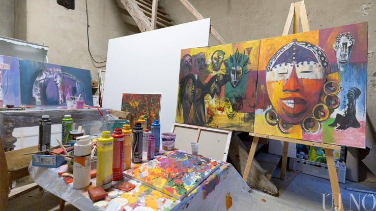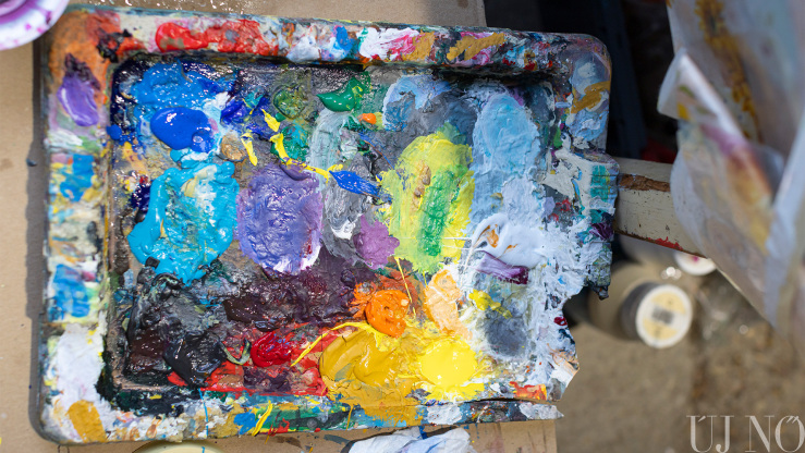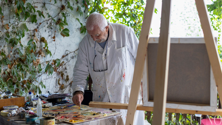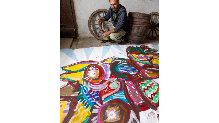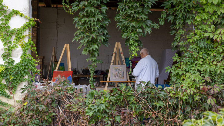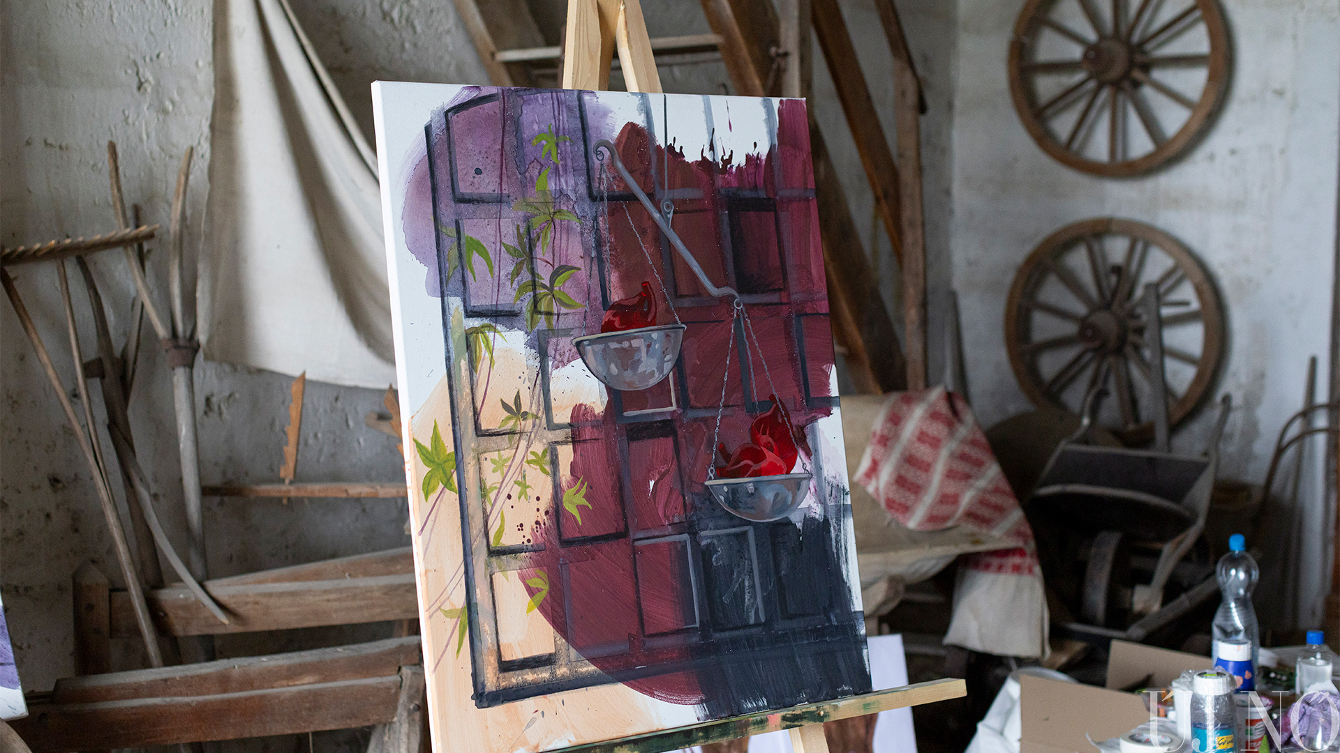 A régi paraszti világ tárgyi emlékei – a lócák, a kredencek, a szőlőprés, a lószerszámok és még sok más rekvizitum – közé elképesztő módon besimultak a bögrékben, csuprokban, üvegekben várakozó különböző vastagságú ecsetek, az egészen vékonytól a szobafestő pemzliig. De voltak itt van Gogh arcát és nevét viselő festékes tubusok, különféle festékes flakonok és paletták is: a kékek, zöldek, sárgák, vörösek és barnák végtelen számú árnyalatai aztán szépen visszaköszöntek az alkotásokon.
