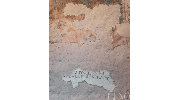Egy Seneca-idézet töredéke a falon: „Mihi videtur infelicius eo, cui nihil umquam evenit adversi.” Magyar fordításban: „Szerintem szerencsétlenebb az, akivel soha semmi baj nem történik.”
